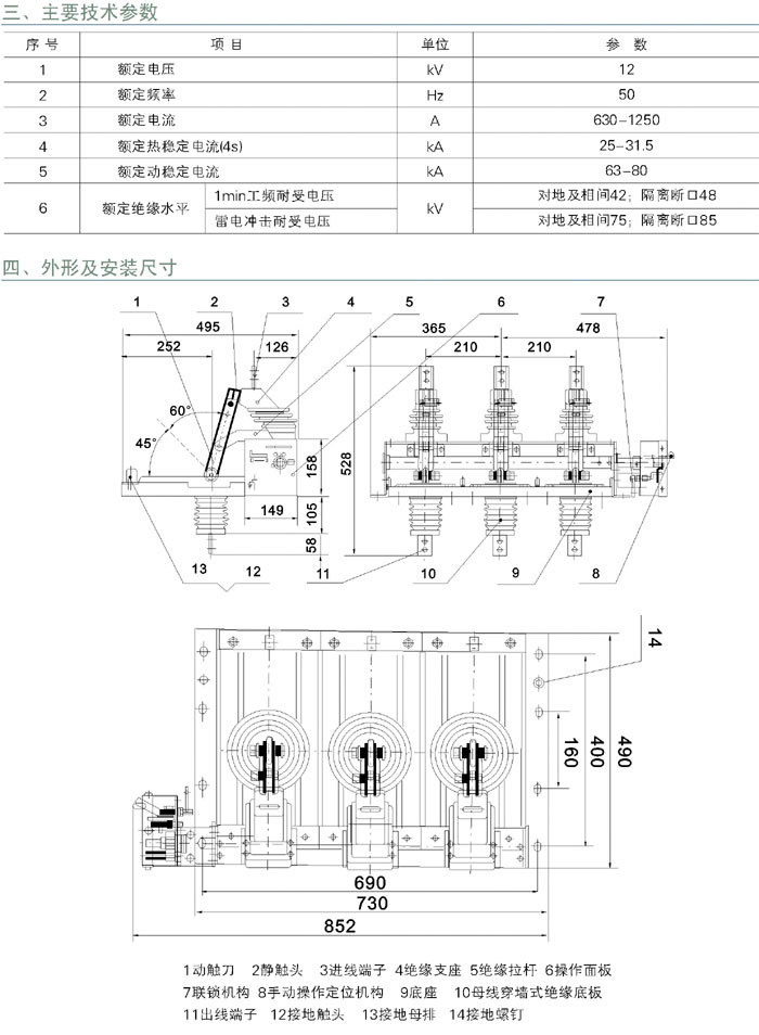 單斷點,三工位結構確保隔離開關合閘時不能接地,接地時不能合閘。