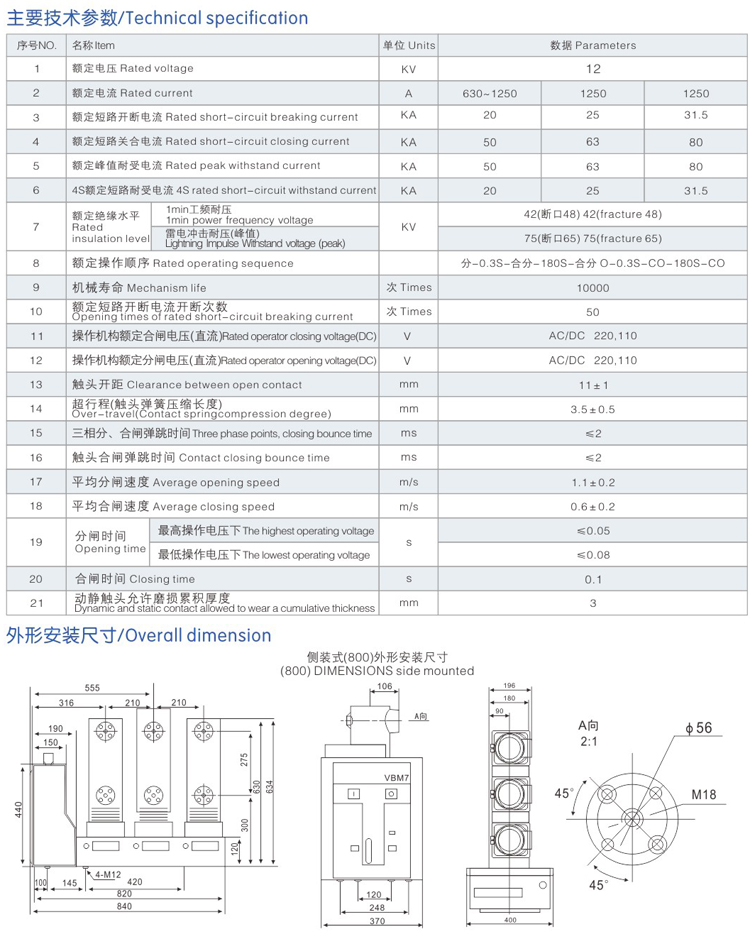 ZN63(VBM7)-12側裝式戶內真空斷路器