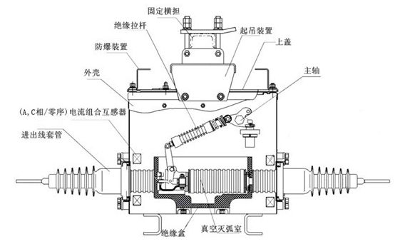 斷路器本體結構由導電回路、絕緣系統、密封件及殼體組成。導電回路由進出線導電桿、導電夾、軟連結與真空滅弧室連接而成。本產品采用SF6氣體絕緣。進出線絕緣套管采用環氧樹脂和硅橡膠整體澆注,為減少開關體積,A、C兩相采用拐角套管,保證良好的外絕緣;內部采用復合絕緣結構,在不充SF6氣體的情況下,也能達到相應的絕緣水平。本產品采用成熟的密封結構。機構罩及殼體上蓋采用沖壓成型槽密封,輸出指針軸采用雙層“O”型圈密封,進出線套管整體澆注,保證良好的氣密性。